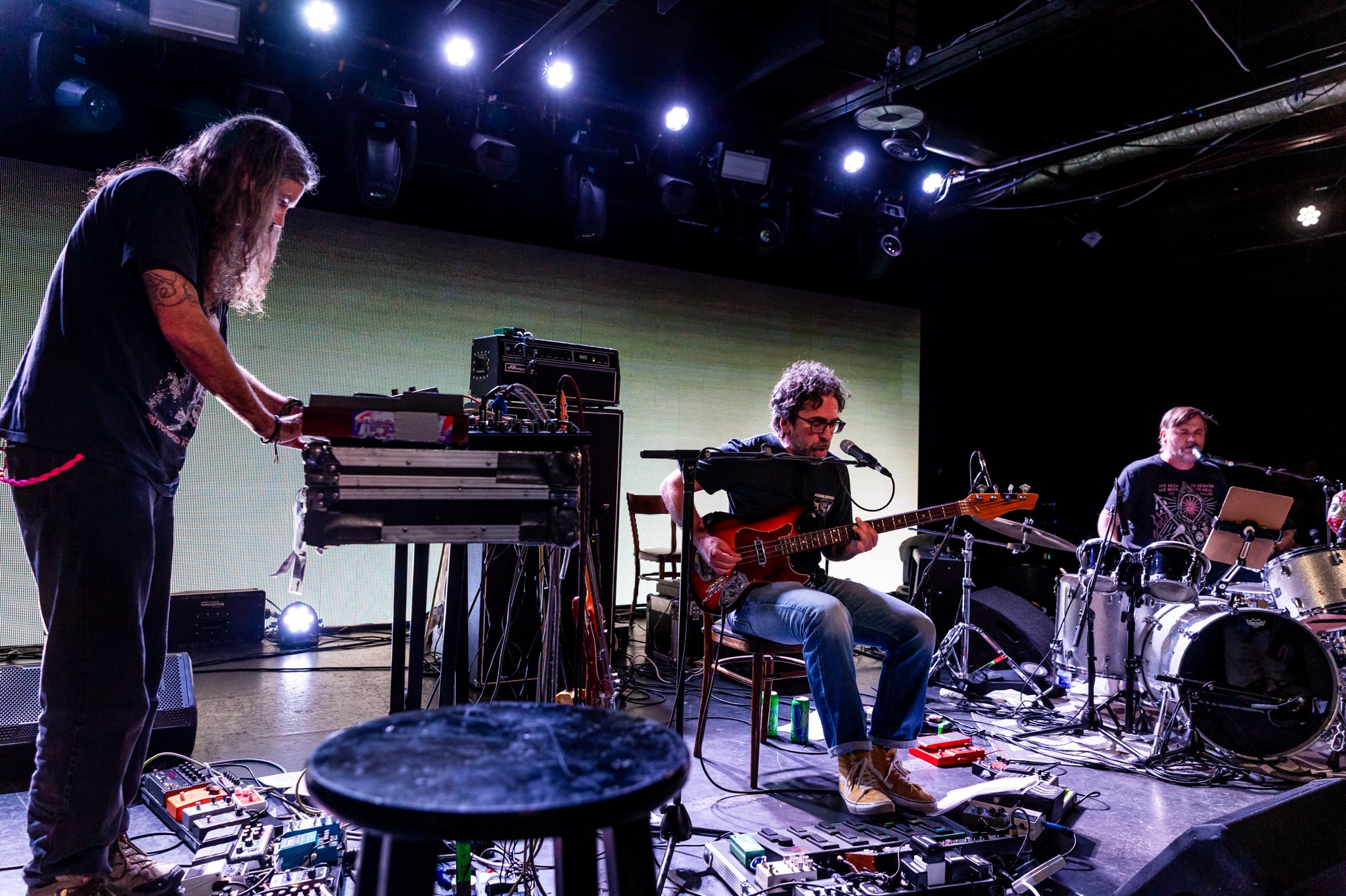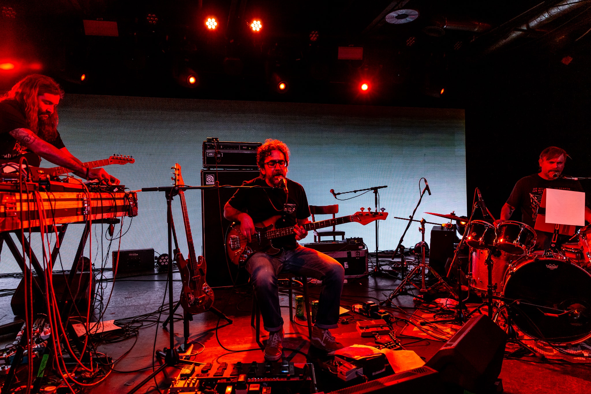 Barrow handled drums and on-stage banter, offering a few dry jokes about Brexit and “the 51st state” that sparked some good-natured back-and-forth with the audience. Bassist Billy Fuller provided vocals throughout and ended the night by holding up a visibly broken bass. Will Young moved between synths, guitar, and various effects, rounding out the trio’s textured, looping sound.