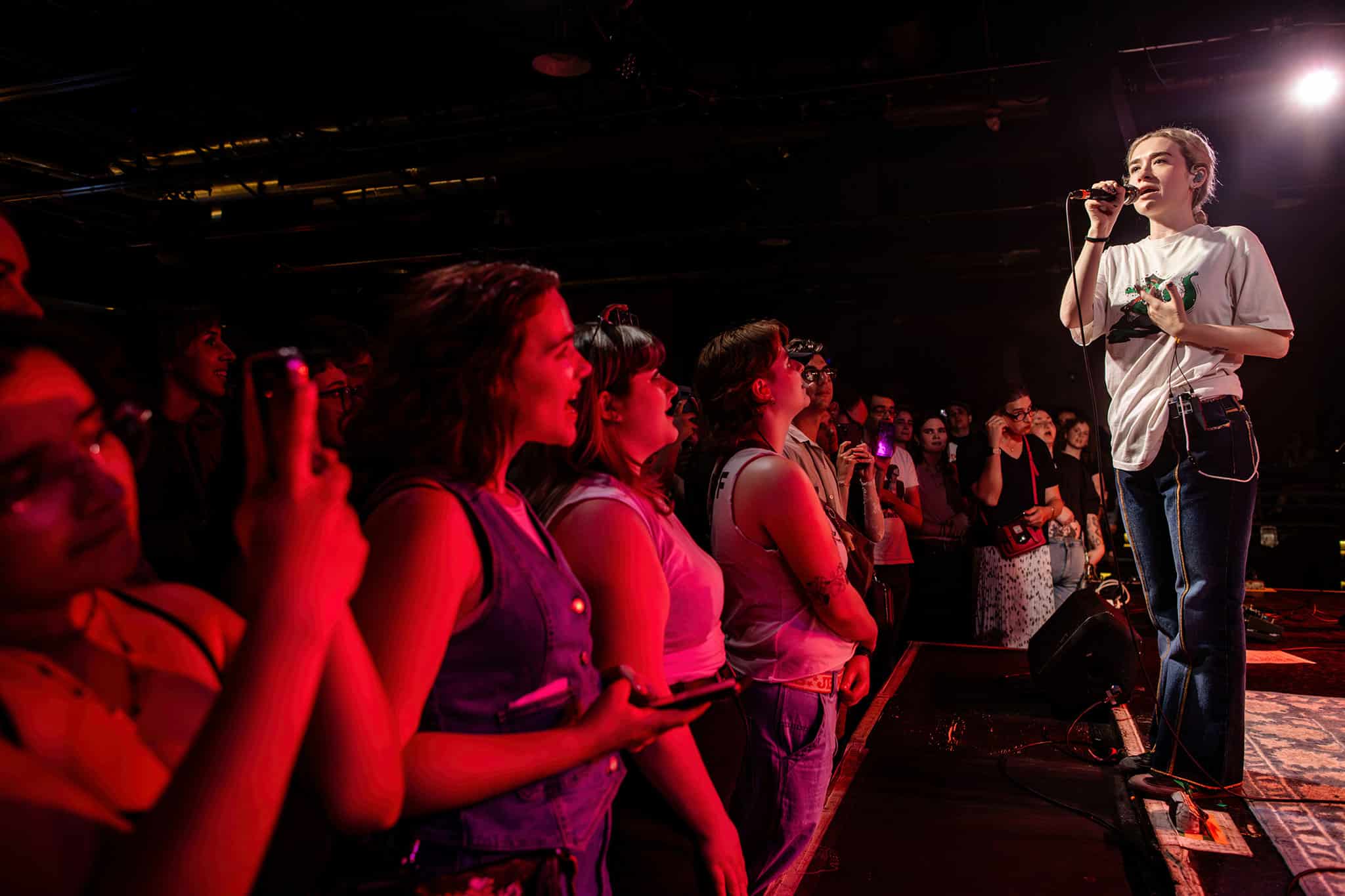 When Sabrina Mae Teitelbaum, aka Blondshell, arrives on stage, it’s definitely not what I expected, based on what I’ve heard. With all that saucy lyrical content peppered throughout her catalogue, I expected some kind of racy glam diva in a short dress… like the other Sabrina, actually (I mean Carpenter). But Ms. Teitelbaum strolls out with a baggy tee, jeans, and hair tied back — more like a punk!