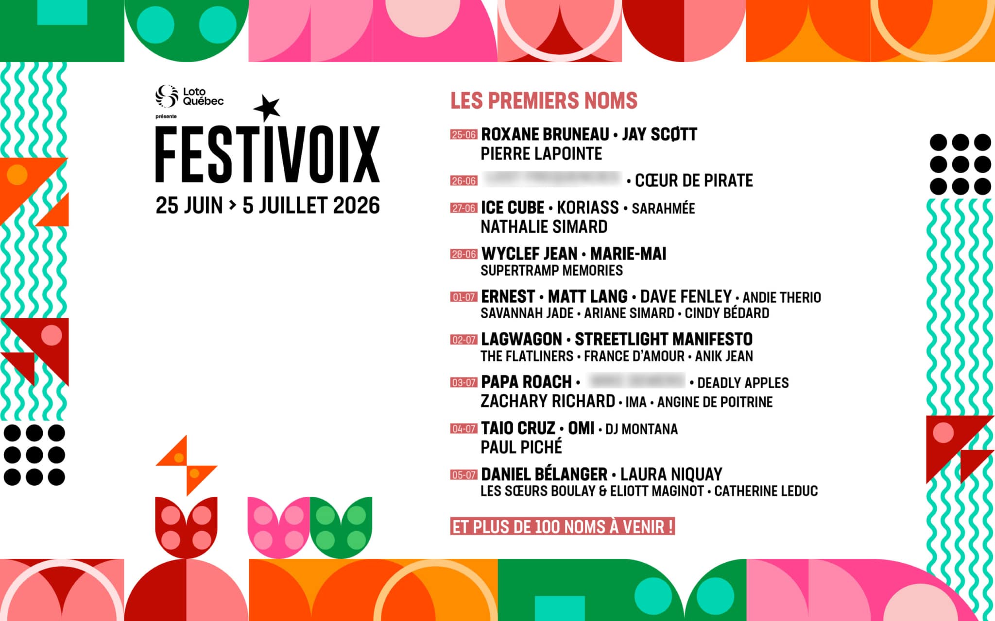 FestiVoix de Trois-Rivières revealed the first 36 artists for its June 25 to July 5 run, headlined by Ice Cube, Papa Roach, Wyclef Jean, and Taio Cruz. The Trois-Rivières festival sold all 18,900 passes in under 36 hours following the announcement, which dropped early after Lagwagon posted the lineup poster on social media before the scheduled reveal.