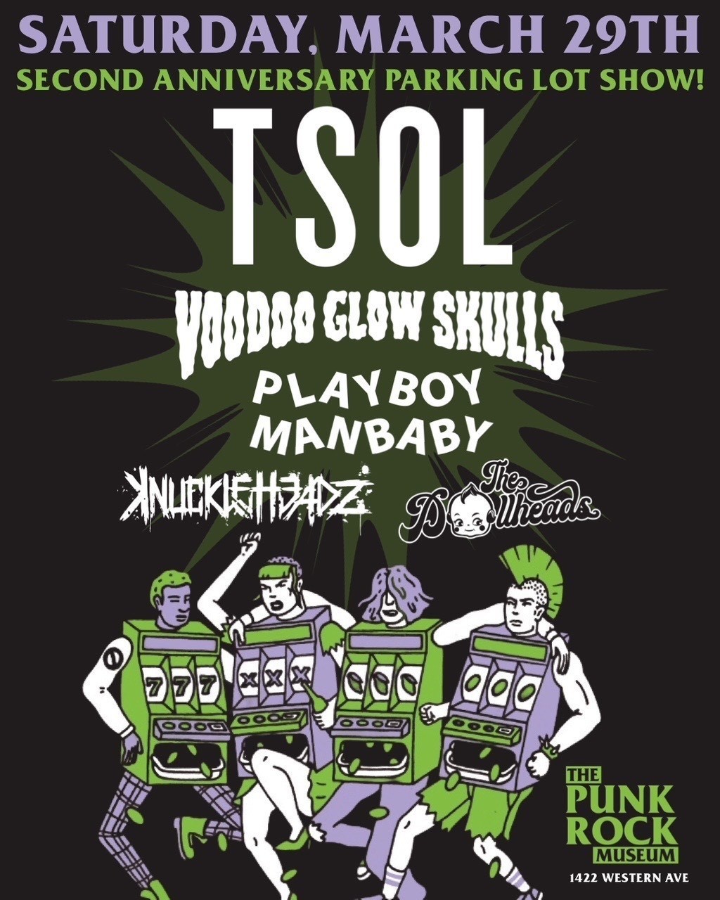 For a whole day of Punk activities, get your ticket to the Second Anniversary Parking Lot Show with The Dollheads, Knuckeheadz, Playboy Manbaby, Voodoo Glow Skulls and TSOL to close the show on March 29th, 2025.