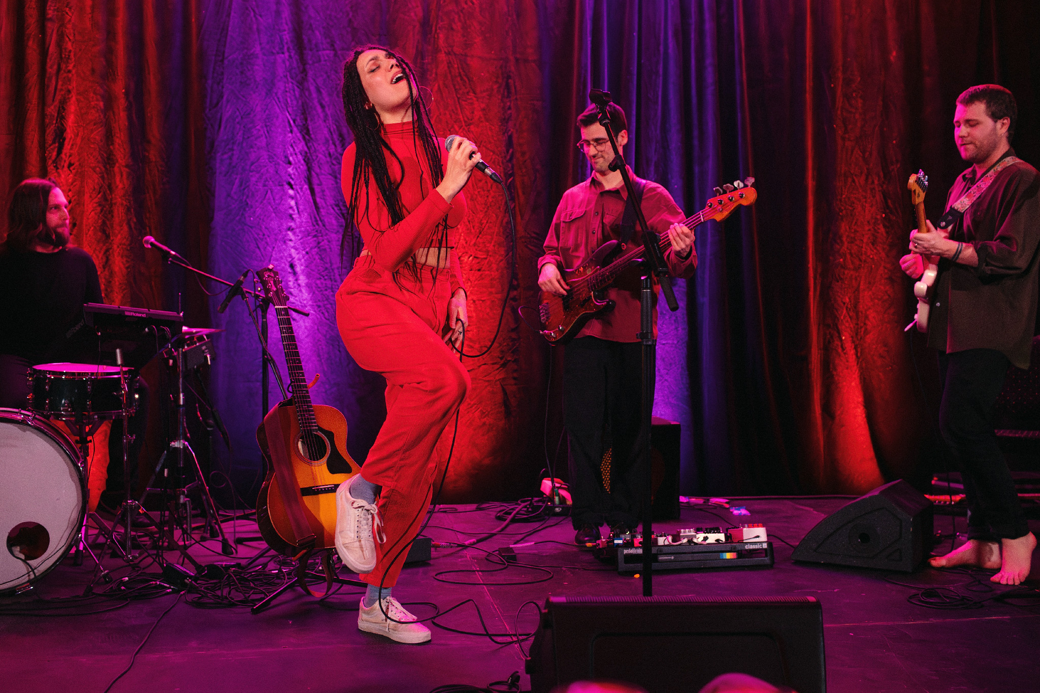 The novelty is not lost on Hanorah either, who inquires a couple of songs in: “How is everyone? Have you got your popcorn?!” The set starts in a soulful manner, the smooth funk of If Life Were a Movie leading into the more chilled Coffee, perfectly showcasing her impressive vocal range, which is almost Aguilera-esque at the end of Matty, the opener from last year’s Closer Than Hell EP. Twin harmonies from drummer Philip and guitarist Maxwell on the lazy strum of Time Waits For No Woman make Hanorah’s vocal sound even more angelic.