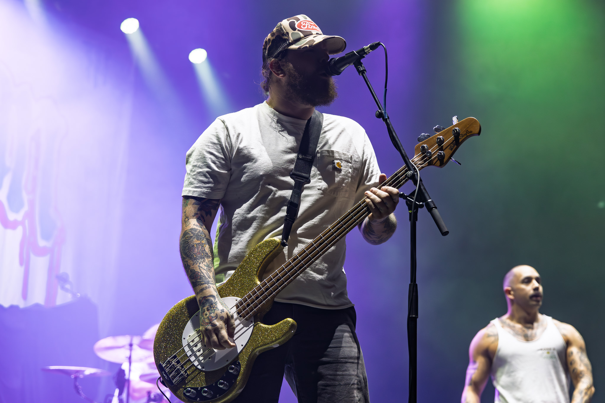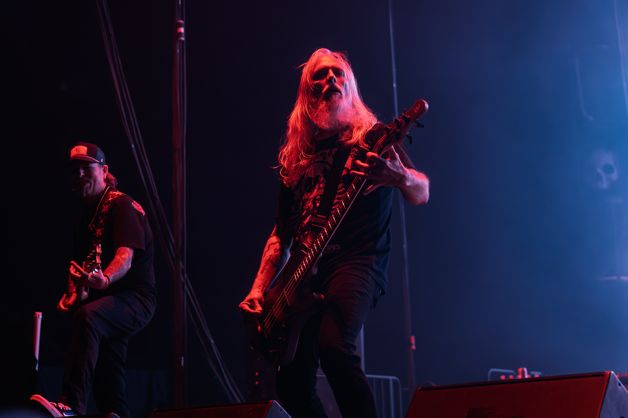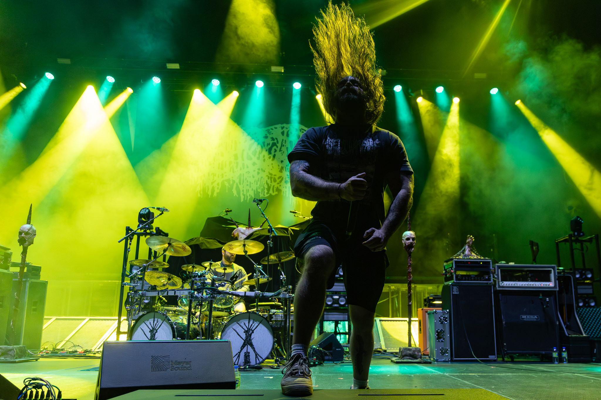 Kublai Khan TX was next to hit the stage, a band that I was surprised to learn are big enough to be billed as direct support for the night’s headliners. I’ve seen more complex technical setups at house shows. Monitor wedges, three amps, and a three-piece, single-kick drum set were all that occupied the massive stage. No fancy light show for their set, and I’m even sure the guitarist and bassist could have gotten by using only their bottom two strings. Yet, what followed was effectively simple, hardcore-influenced heavy metal to go wild to. The band fed off the crowd’s passion, as frontman Matt Honeycutt encouraged the two-steppers in the pit with a stern southern drawl while sporting his military cap and wife-beater. These Texans oozed charm, and the music’s lack of complexity wasn’t at all a drawback. As Honeycutt said best, Kublai Khan TX like to keep things simple. You don’t need a lot of ingredients to make a heavy meal.