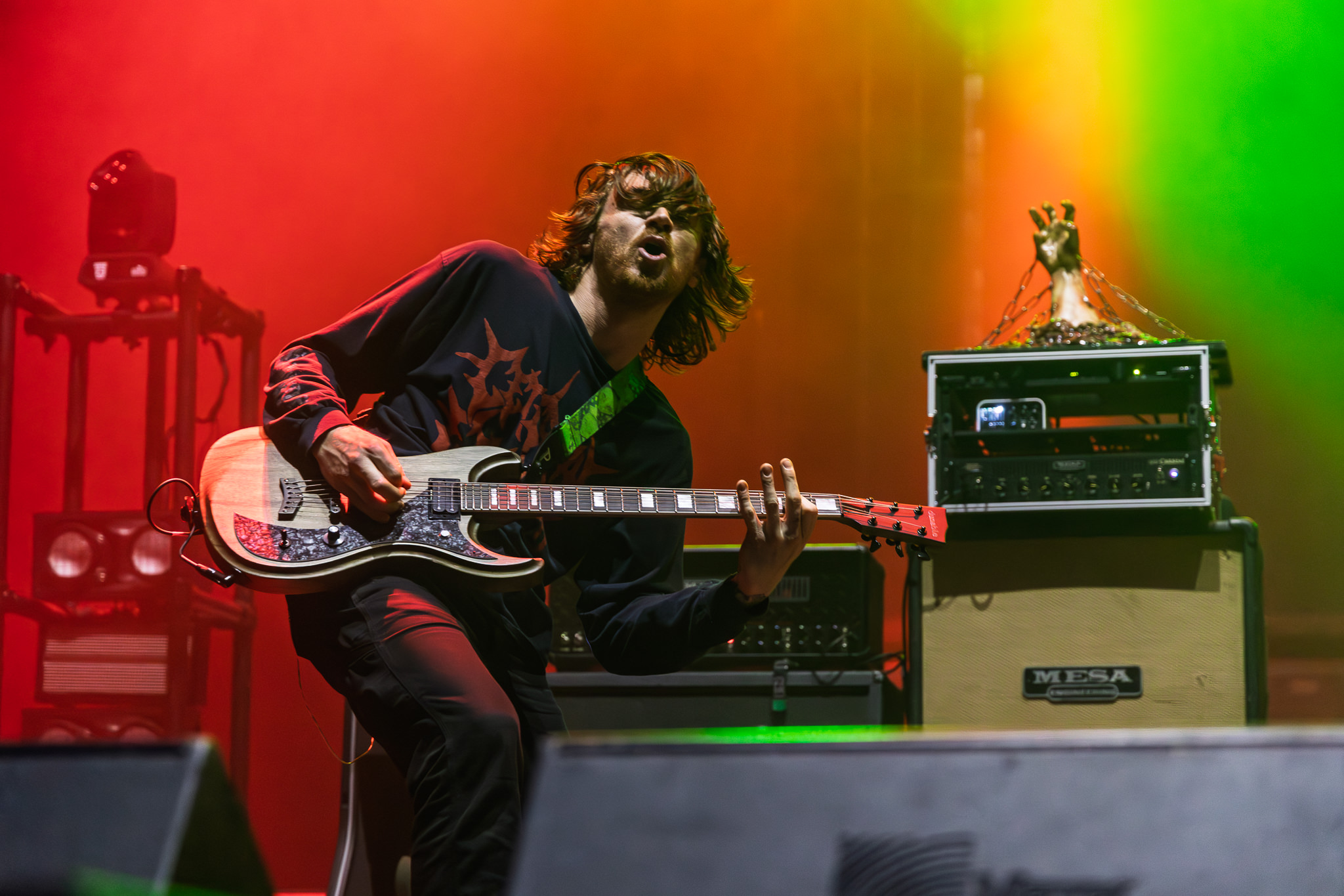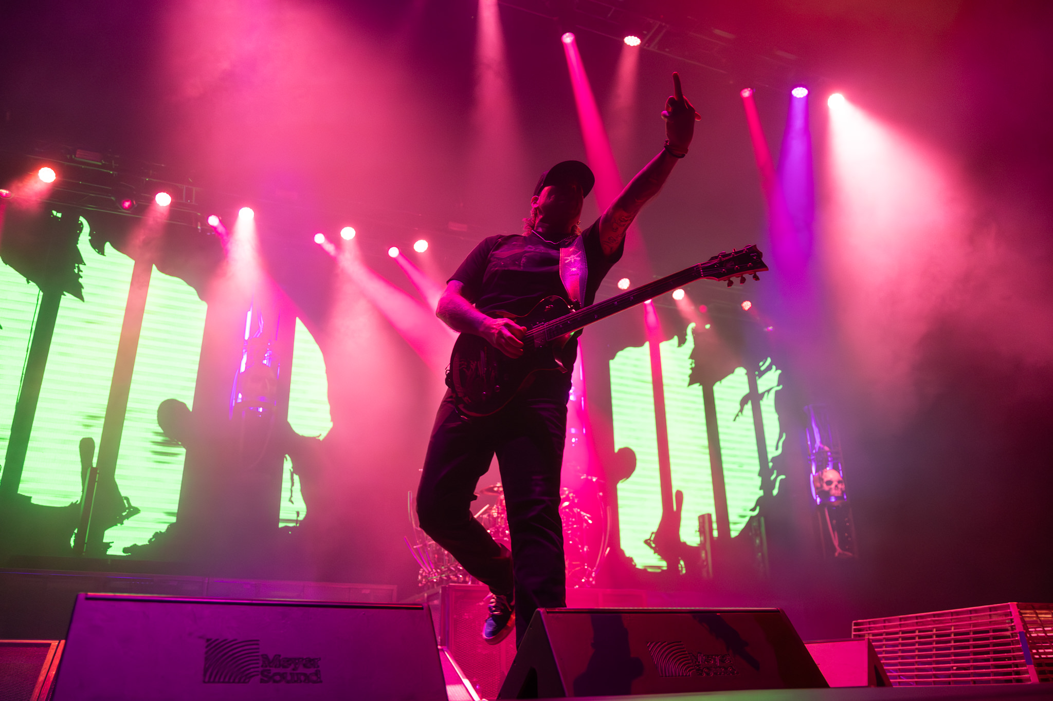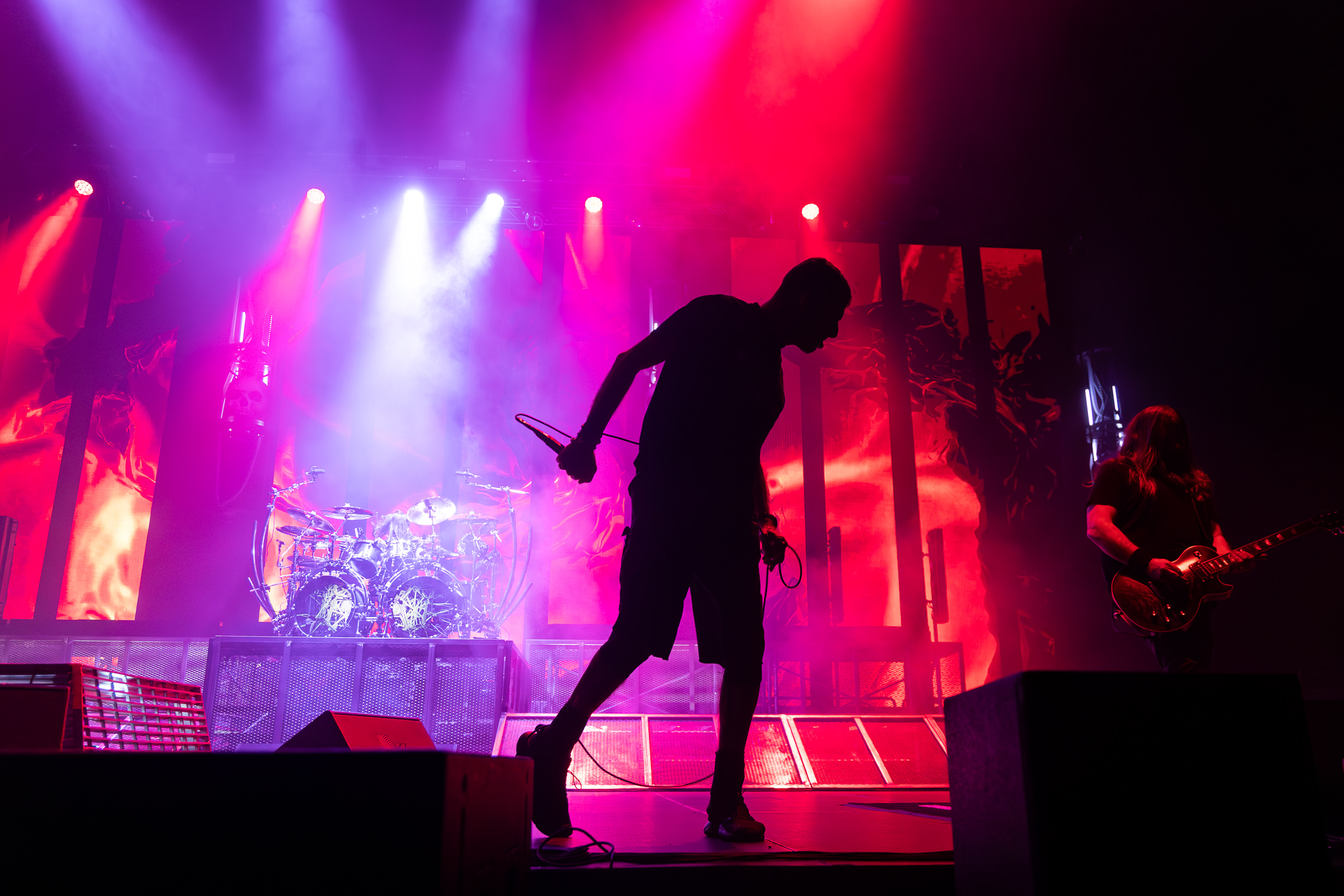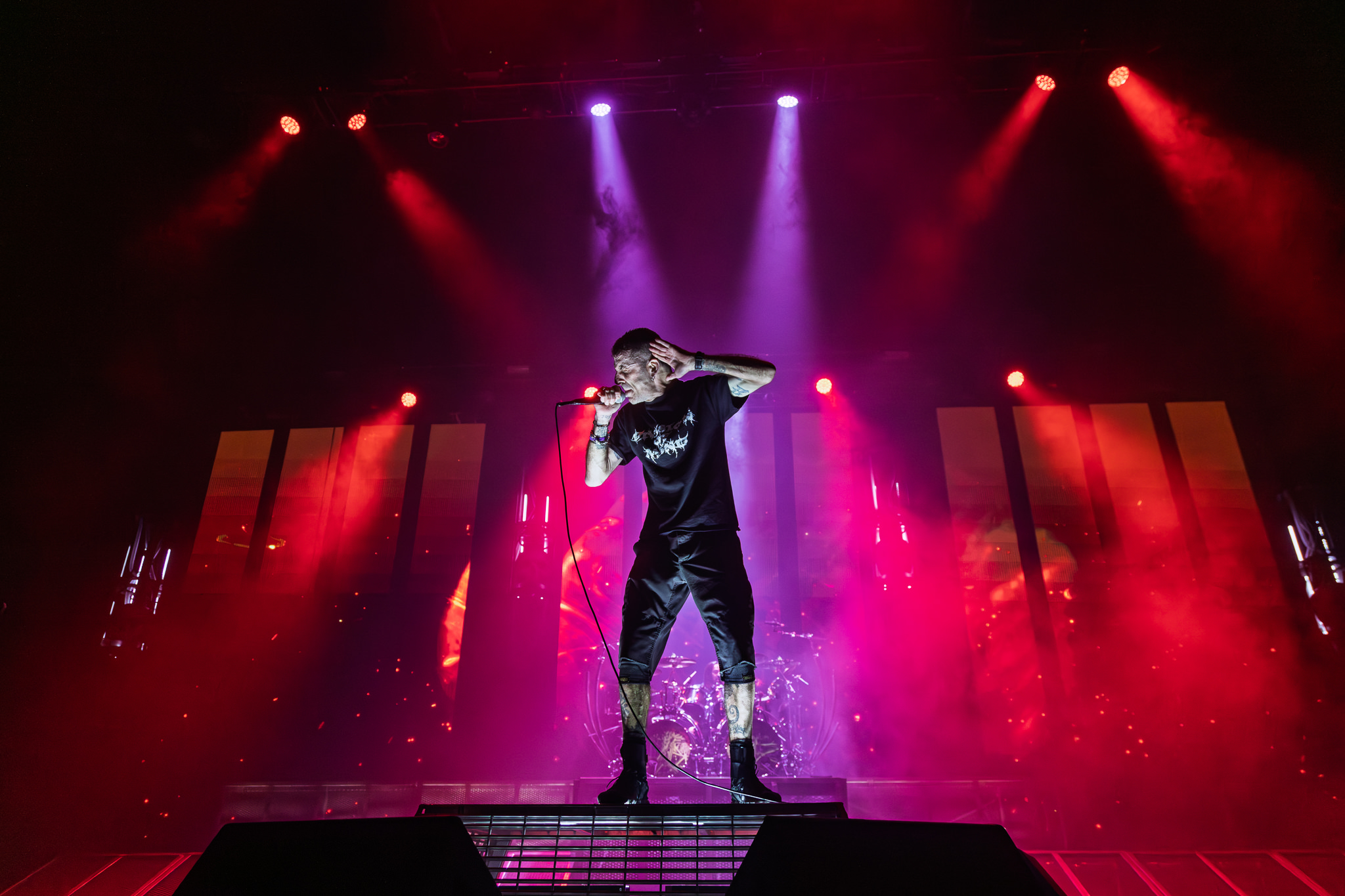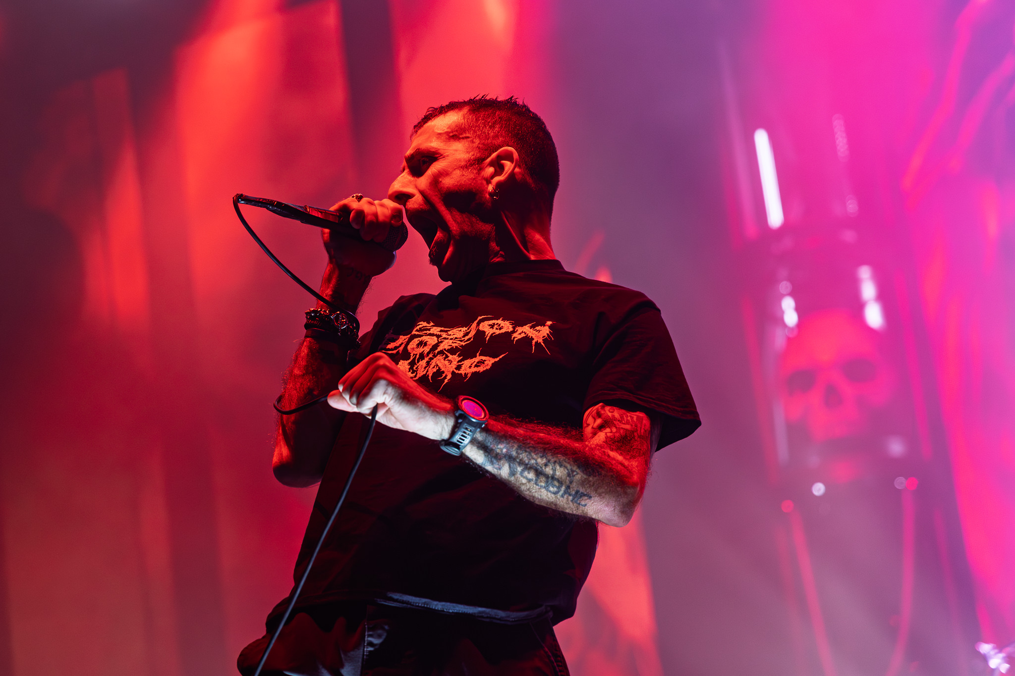 Finally, Lamb Of God were next to amaze the audience. Their new logo projected onto a black curtain was met with a roaring crowd. The curtain dropped as the band broke into Ruin, and expertly controlled chaos followed. The light show was marvellous as well, as unorthodox fusions of colours painted the stage, and video walls between set decor displayed some captivating animations. It was just as much a visual feast as it was an auditory one.