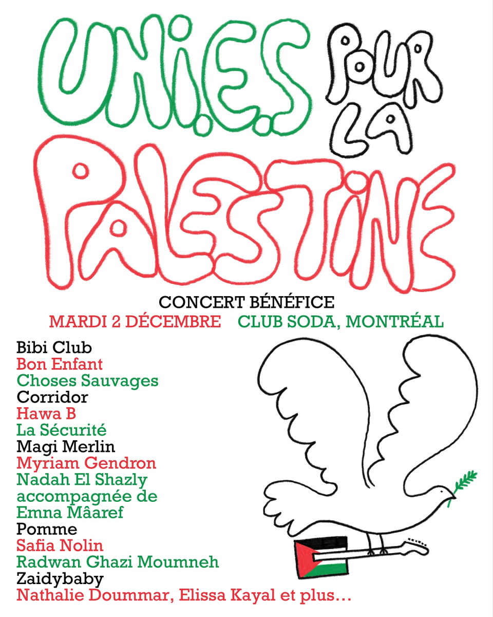 Bibi Club, Bon Enfant, Choses Sauvages, Corridor, HAWA B, La Sécurité, Magi Merlin, Myriam Gendron, Nadah El Shazly, Emna Mâaref, Pomme, Safia Nolin, Radwan Ghazi Moumneh (of Jerusalem In My Heart), and Zaidybaby will perform at Club Soda as part of United for Palestine, a benefit concert for Palestinian children and refugees. The money raised goes to The Sameer Project and The Ghassan Abu Sittah Children’s Fund.