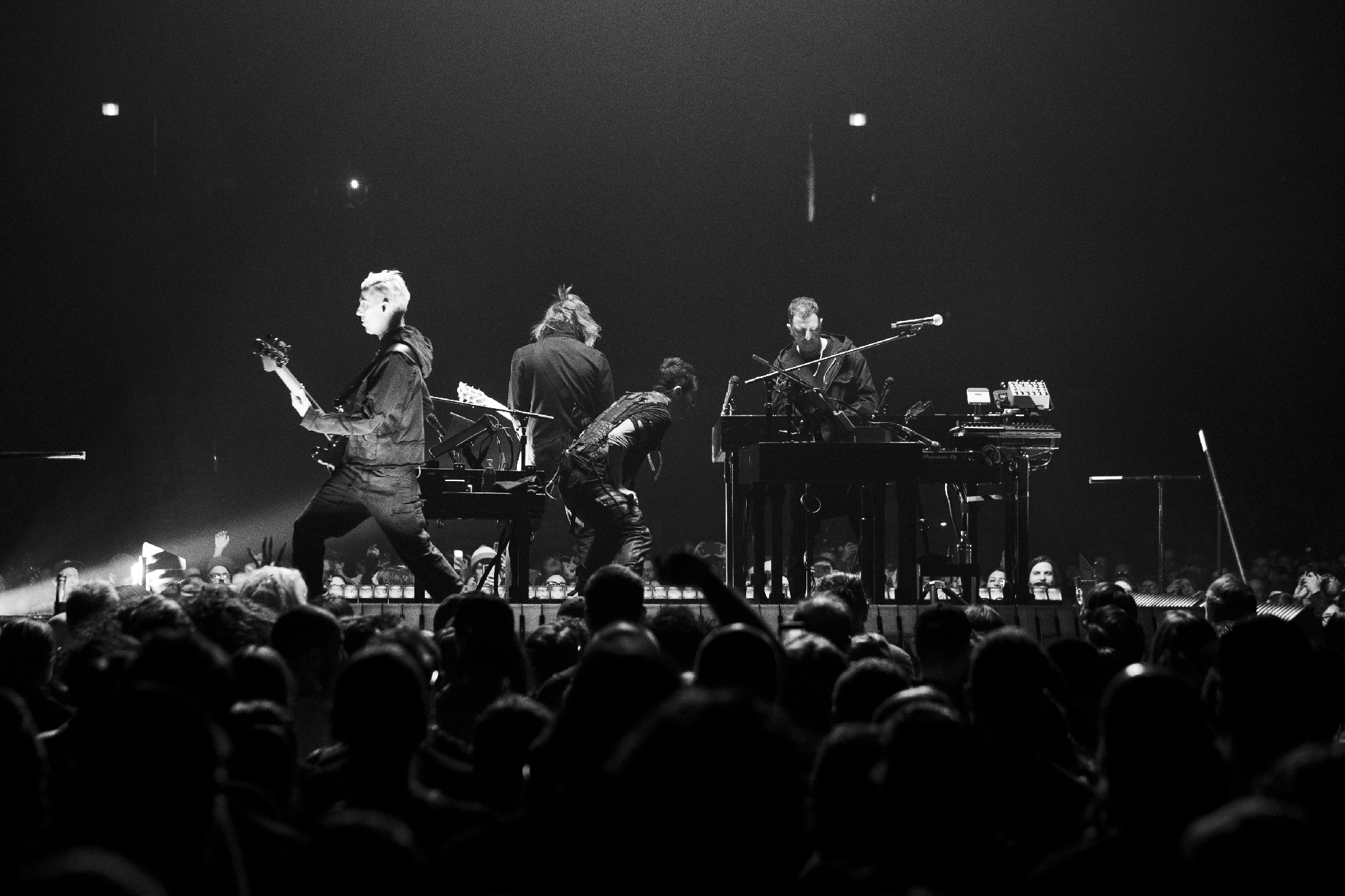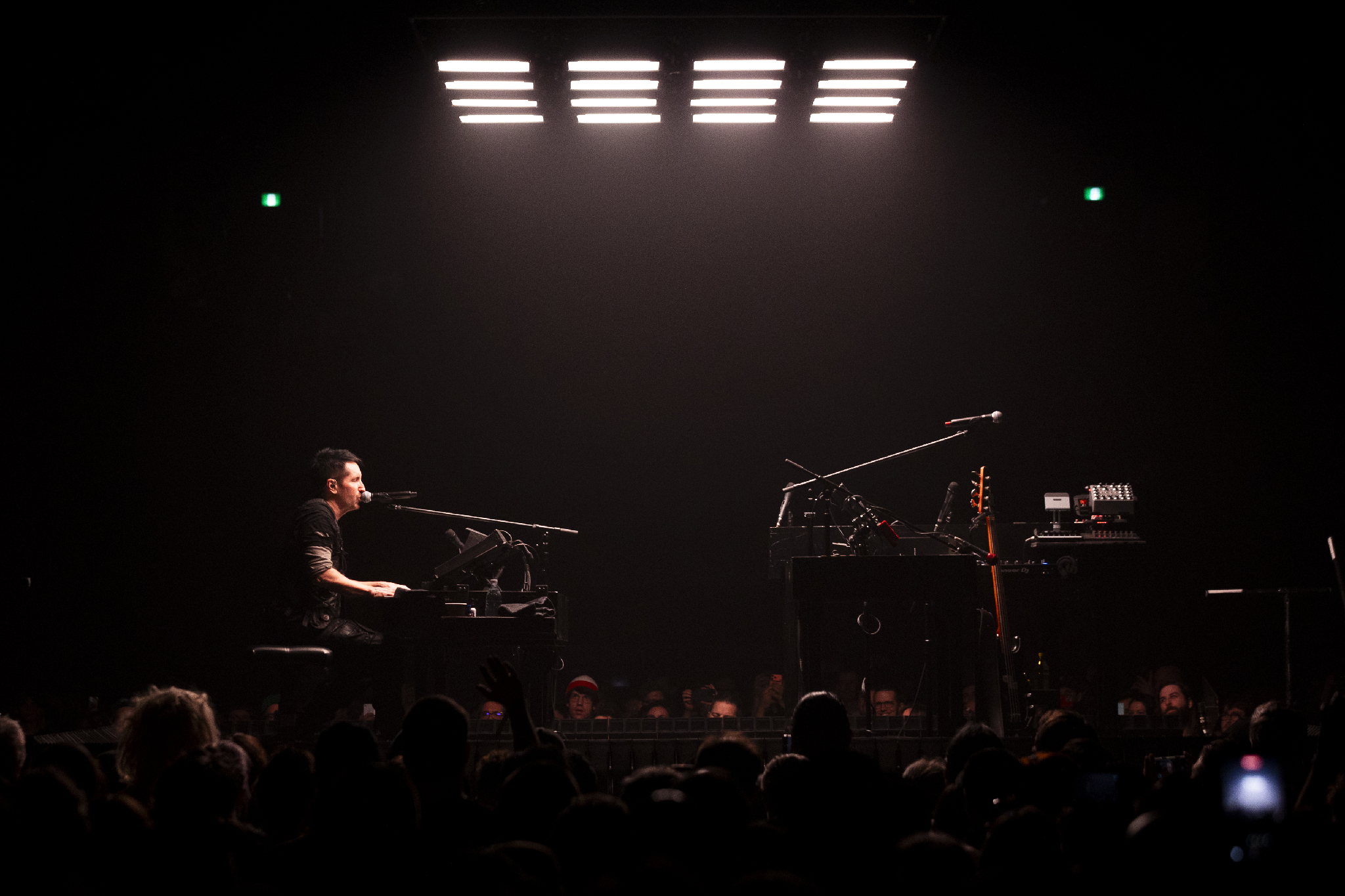 The show starts in unsurprisingly dramatic fashion, as the thumping house music of opener Boys Noize cuts out to near silence, with just Trent at a piano on a small stage in the middle of the Bell Centre floor. Under a single spotlight, he starts with the delicate Something I Can Never Have, which sounds absolutely spectacular, and is about as quiet as the show gets all night! The rest of the band slowly join Trent as Non-Entity rolls with its eerie drum machine beat, before Trent leaves the piano altogether and prowls the perimeter of the small stage on Piggy (Nothing Can Stop Me Now).