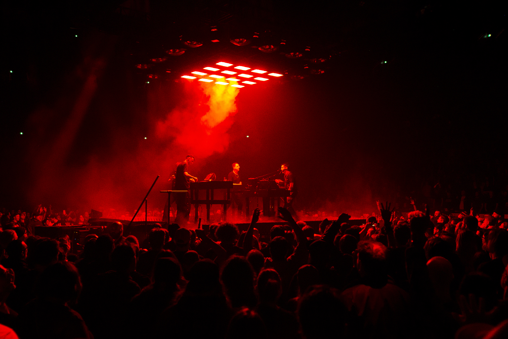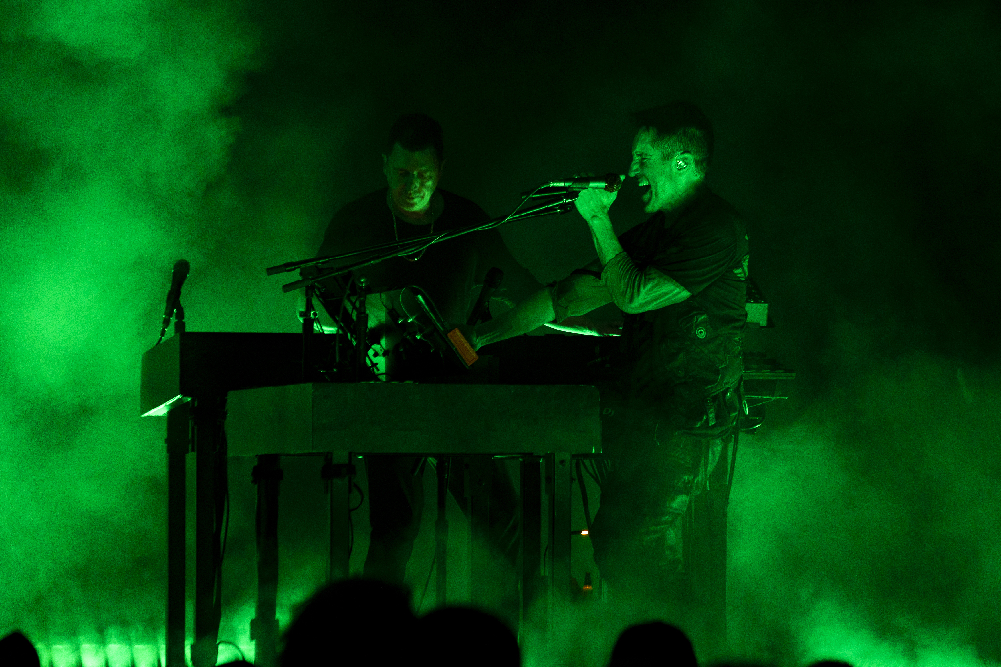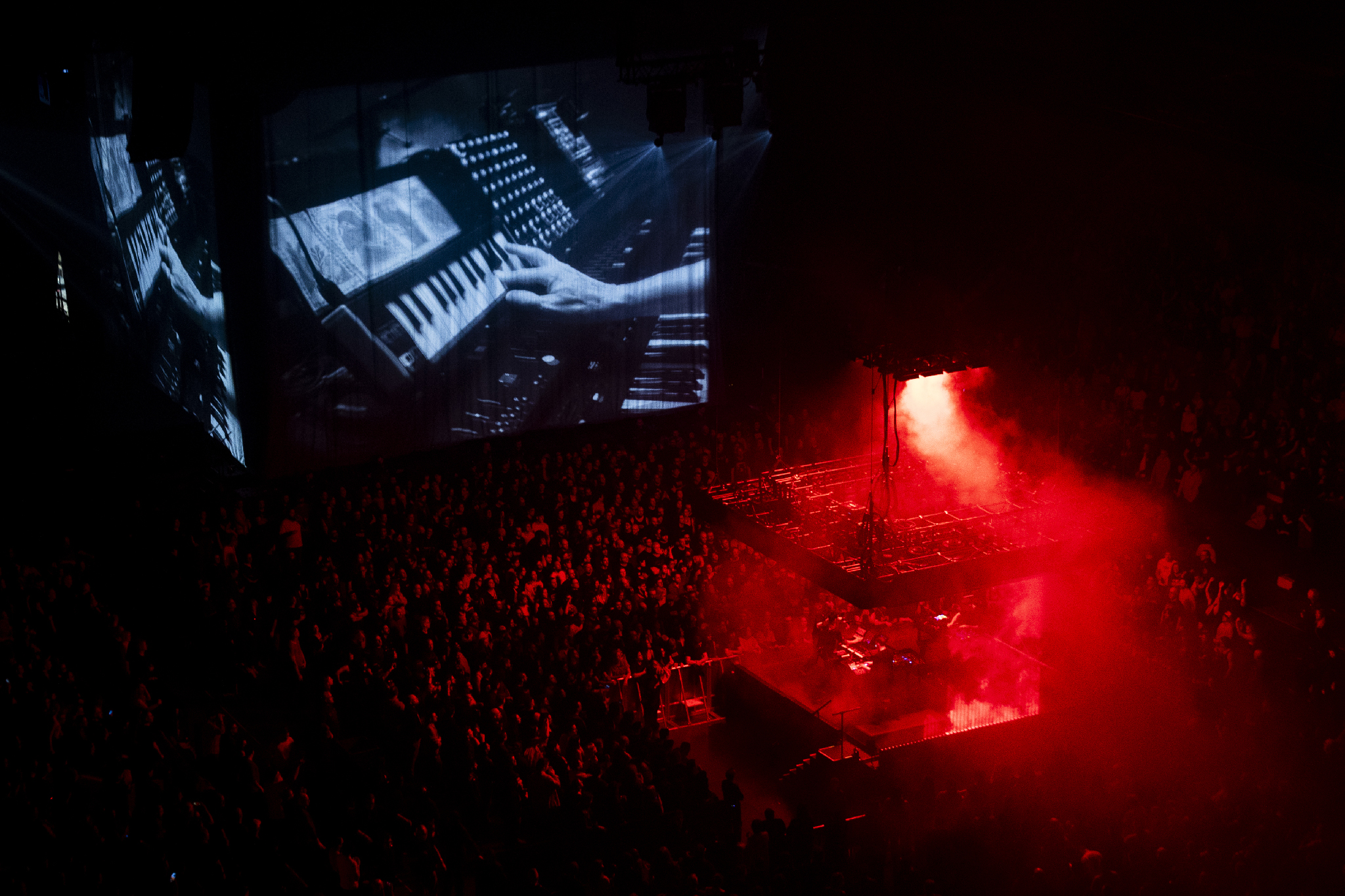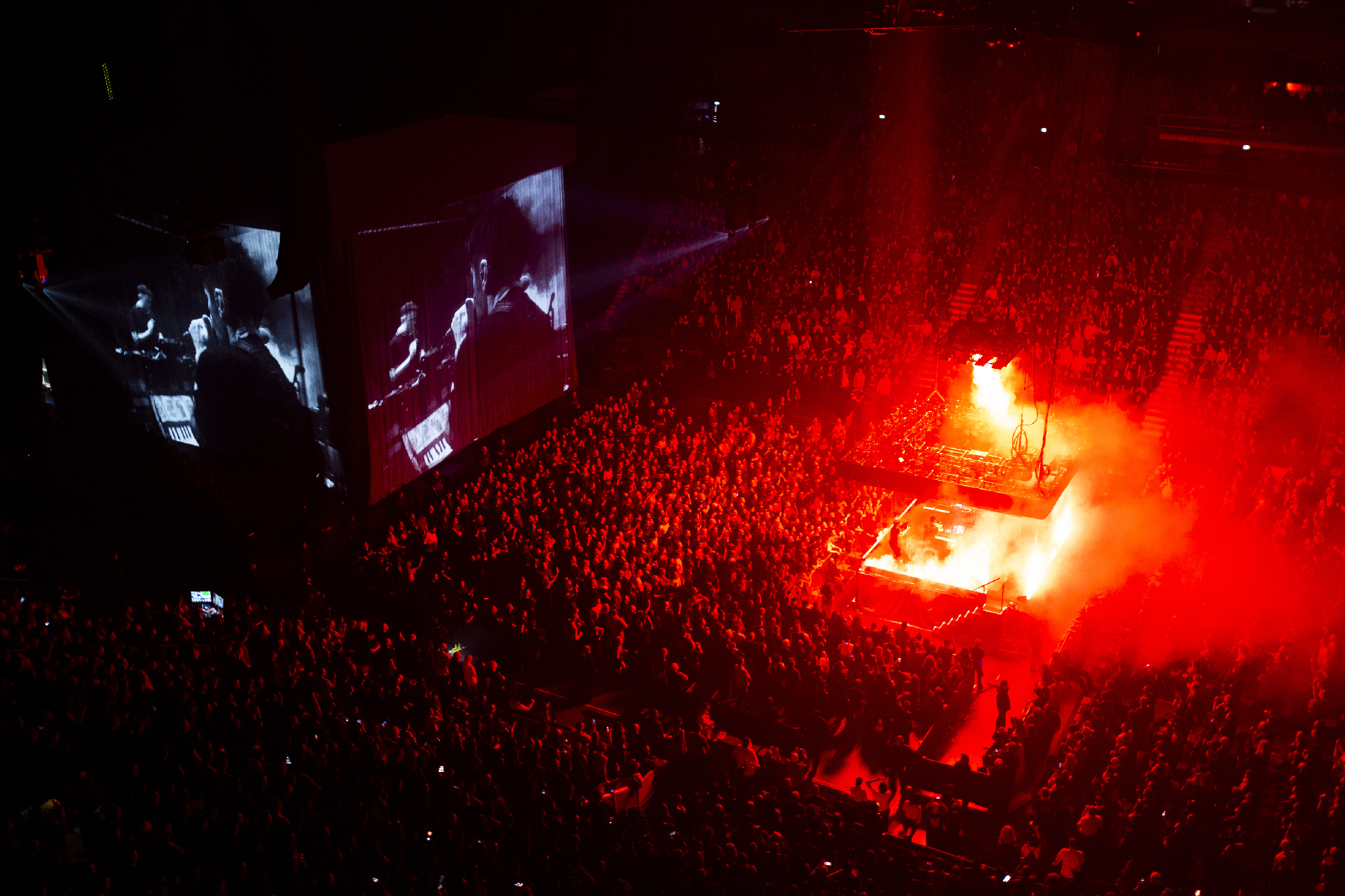 The dim red light continues as Trent and Atticus scurry back across the floor to the small centre stage, where Boys Noize is waiting for them. The trio launch into the sinister electronica of She’s Gone Away, merging in elements of the NIN song Vessel and Girl Crush by Boys Noize himself. Closer is also reworked, with the small stage erupting in purple light at that vulgar chorus, before turning green on Parasite, anthemic in its I Feel Love techno vibes. The rave feels are accentuated by the smoke that pours vertically down on them from overhead. As Alive as You Need Me to Be wraps up the section on the smaller stage in epic fashion; the beat drops are massive, and the Bell Centre feels like a club! Boys Noize concludes the song by himself as Trent and Atticus hurry back to the main stage for the final act.